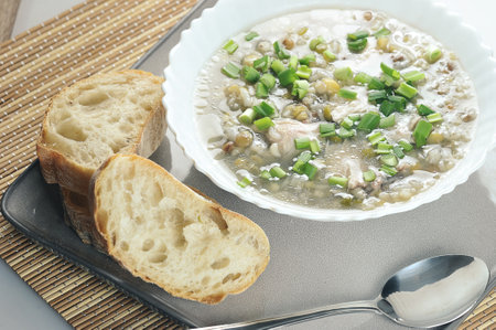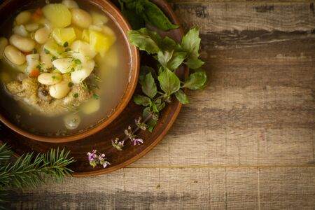 Rustic winter soup of russian cuisine, bowl of chicken soup with beans. Top view, copy space