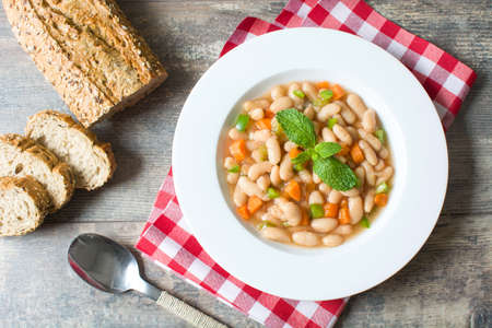 Homemade soup with white beans and vegetables in white bowl on a black wooden background.