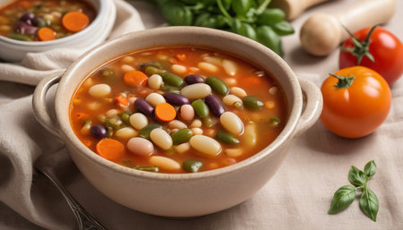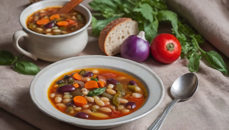 Italian minestrone soup with vegetables and beans on a table with a linen tablecloth