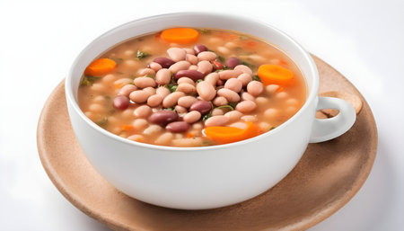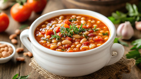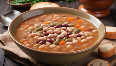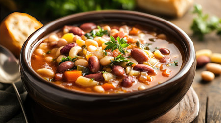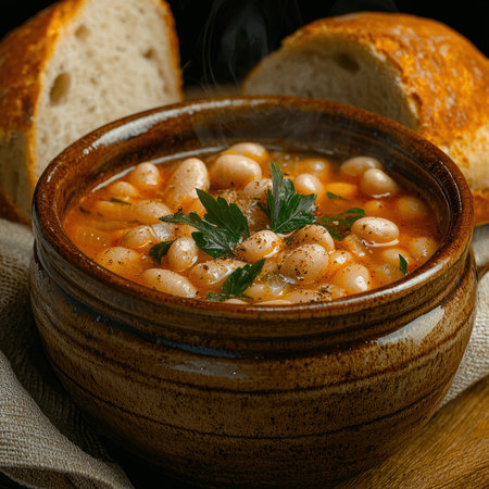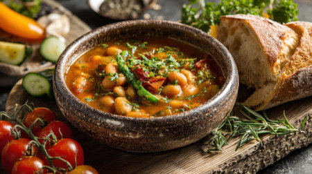A hearty bean stew is beautifully presented in a rustic bowl paired with crusty bread and colorful veggies.