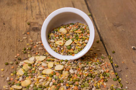 View of the pulses, cereals, beans and peas soaked in water as a preparation step for cooking.