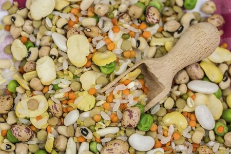 Legume abstract - top view of a variety of colorful bean, lentil and pea