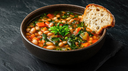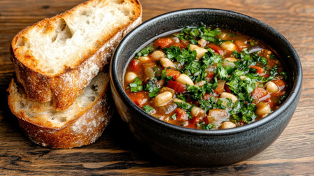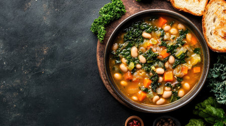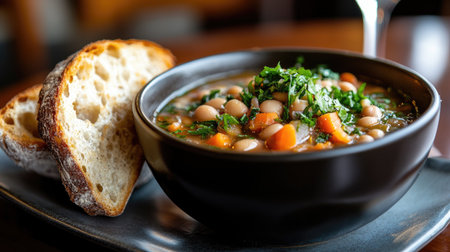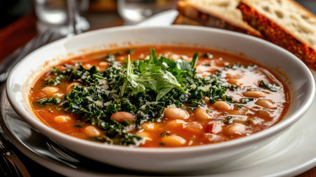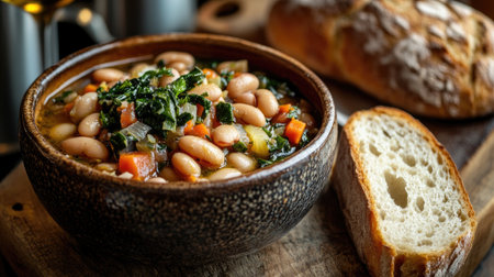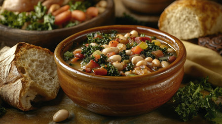 A hearty vegetable soup featuring beans and kale, served in a rustic bowl alongside fresh bread. Perfect for warm meals or healthy dining.