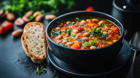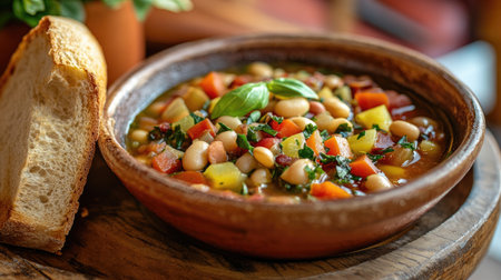 A hearty bowl of minestrone soup brimming with fresh vegetables and beans, paired with a slice of rustic bread, perfect for any comforting meal.