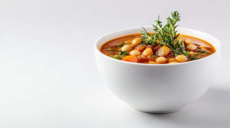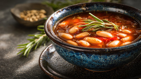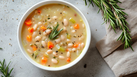 A rustic bowl filled with hearty white beans stew, garnished with fresh rosemary, showcases delectable flavors and rich textures, perfect for food photography.