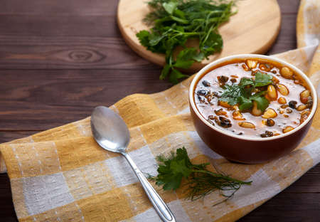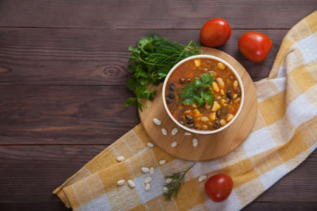 Bean soup with salad and parsley and a spoon stand on a yellow linen tablecloth on a wooden background
