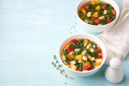 Vegan bean soup with vegetables and kale cabbage in white bowls on blue background, free space, horizontal