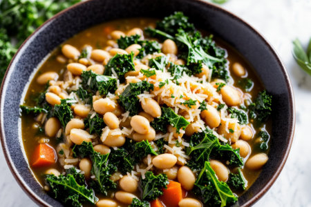 Close-up of kale and white bean stew in a rustic bowl, steaming and ready to serve, garnished with grated Parmesan. AI generated.