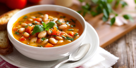 This hearty minestrone soup features a colorful mix of vegetables and beans, beautifully presented in a rustic bowl. Ideal for cozy meals.