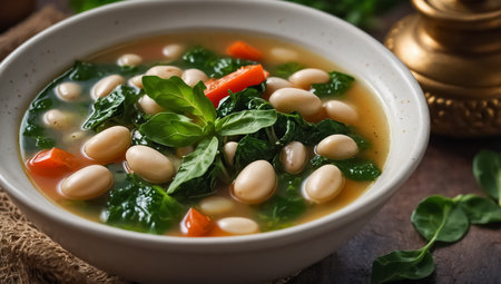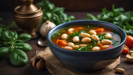A delicious bowl of kale and bean soup, showcasing vibrant ingredients in a rustic setting. Perfect for a healthy meal option that warms the soul.