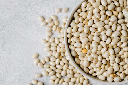 Raw Organic Dry White Beans in a Gray Bowl, top view. Flat lay, overhead, from above. copyspace.