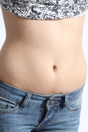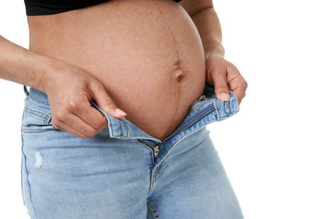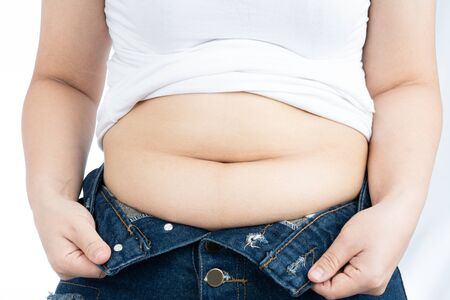 Saggy belly. Folds of leather and fat on the sides hanging over the waist of the jeans. A figure spoiled by overeating or pregnancy. Obesity and Diabetes. White background. Cellulite flabby muscles