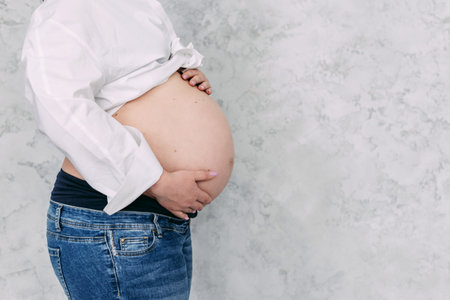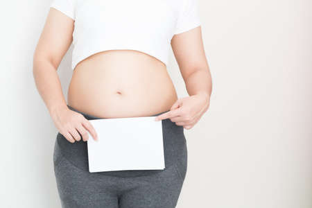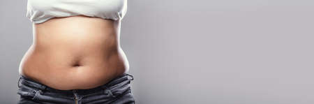 Woman with fat flabby belly, overweight female body on gray background. lower abdomen under T-shirt Of Woman With Excessive Belly Fat. Weight loss, diet lifestyle, healthy concept.
