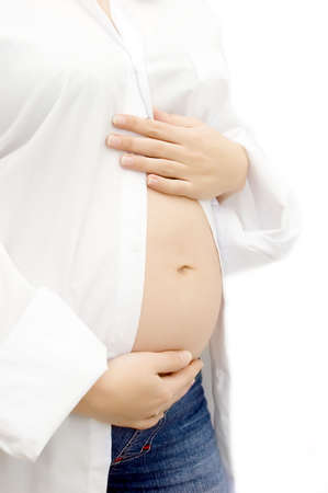 Happy pregnant woman taking care of her child isolated on white background. The young expecting mother holding baby in pregnant belly. Maternity prenatal care and woman pregnancy concept.