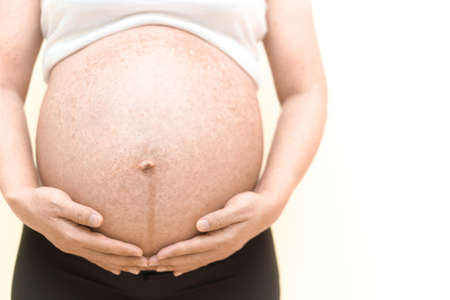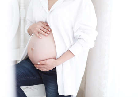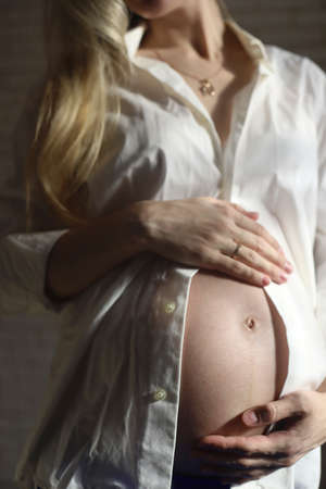 Close-up of a pregnant woman in a white shirt, gently stroking her stomach with her hands in the late stages of pregnancy. Waiting for the baby. High quality photo