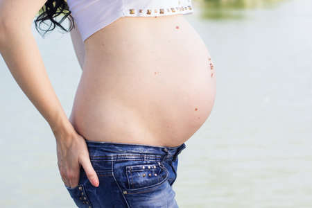 Closeup picture of belly of pregnant woman near blue river, summer time, pregnancy girl