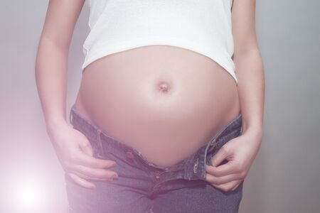 caucasian pregnant girl in unbuttoned jeans and a white t-shirt holding on to naked belly in the studio on a gray background