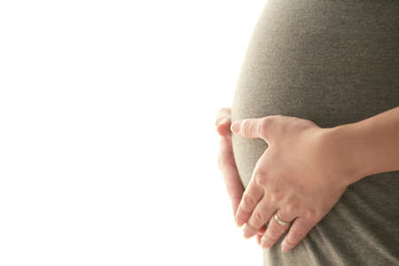 Pregnant woman gently cradling her belly, eagerly anticipating the arrival of her baby, set against a serene white background
