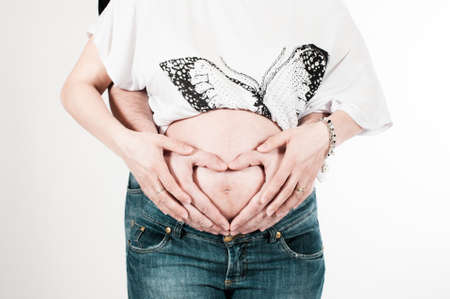happy pregnant woman on white background with crossed arms and hands of the father a heart-shaped on the belly