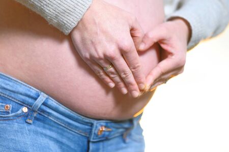 Pregnant Woman holding her hands in a heart shape on her baby bump. Pregnant Belly with fingers Heart symbol. Maternity concept. Baby Shower