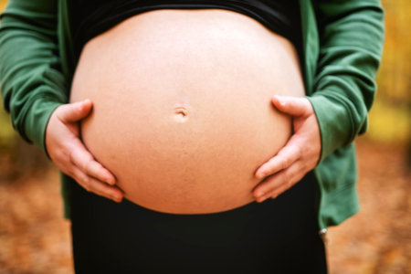 Close-up of a pregnant woman gently and lovingly stroking her belly with her hand in the late stages of pregnancy
