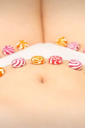Round candies lying in a row on female bikini zone, the concept of intimate depilation, problems of intimate hygiene.