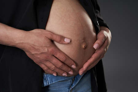 Saggy belly. Folds of leather and fat on the sides hanging over the waist of the jeans. A figure spoiled by overeating or pregnancy. Obesity and Diabetes. Black background. Cellulite flabby muscles