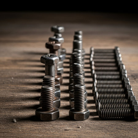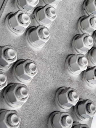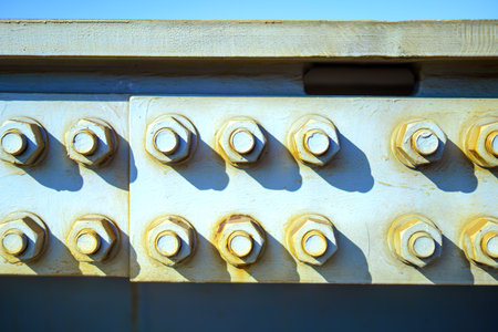 two rows of large bolts and nuts, integral for securing bridge metal structures, symbolizing strength, durability, and engineering precision.