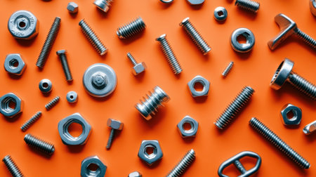 A vibrant closeup of assorted metal fasteners including nuts, bolts, and screws arranged neatly on an orange background, ideal for industrial themes.