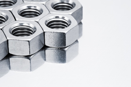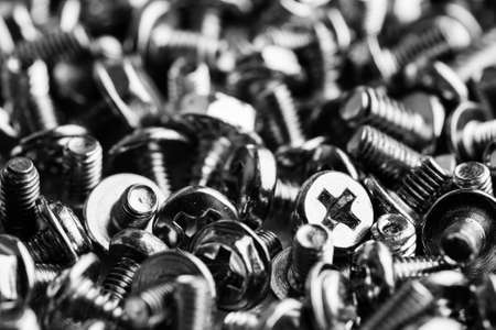 Chromed screw nuts isolated. Steel nuts pattern. Set of Nuts and bolts. Tools for work. Black and white. Different tools with place for text.