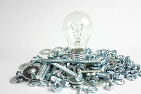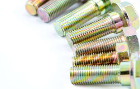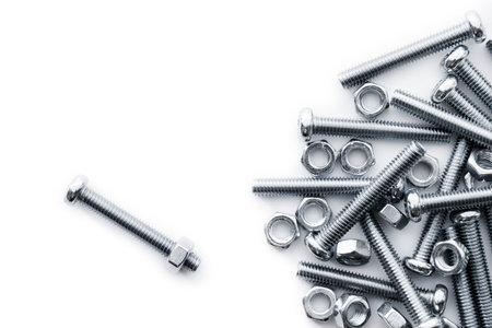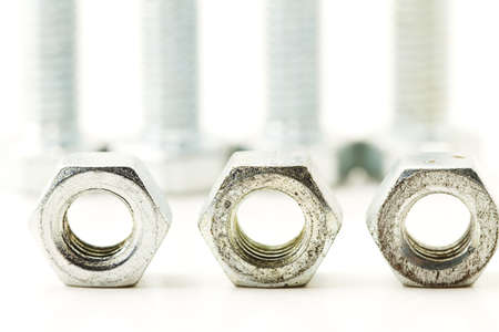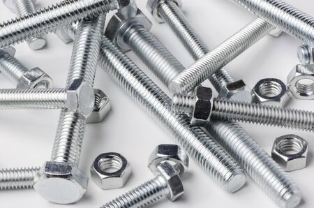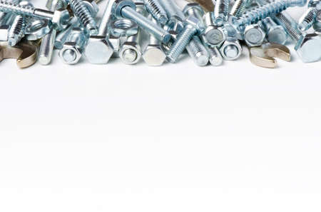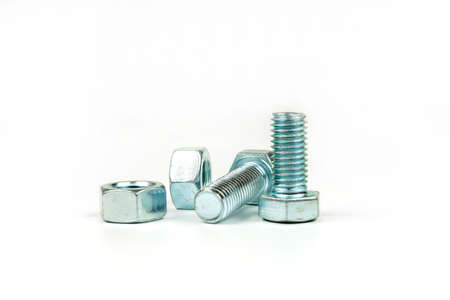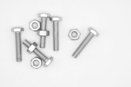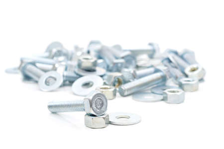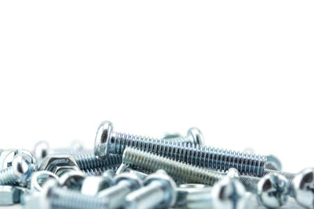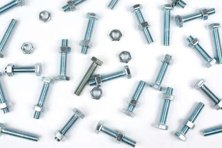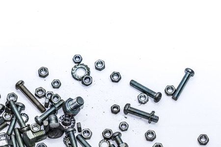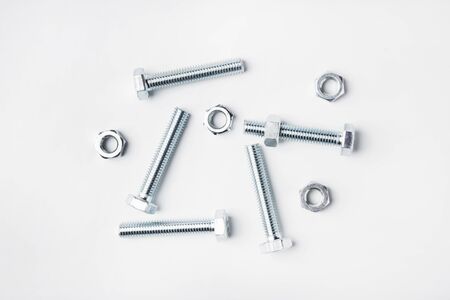 Lots of metal bolts and nuts. Tool for fixing. White background.