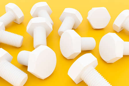 3d illustration of a group of white metal screws on a monochrome yellow background
