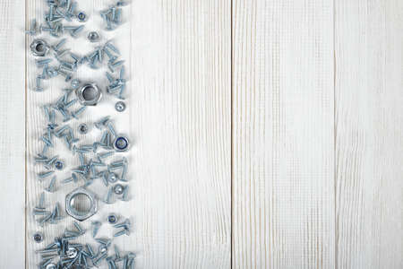Metal tapping screws for wood on white wooden background. Construction equipment concept. Copy, empty space for text.