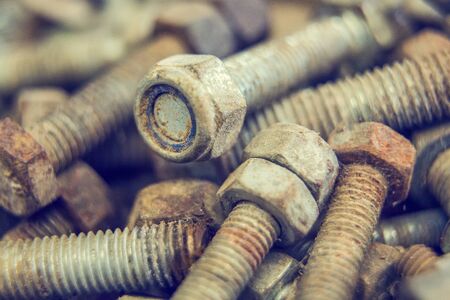 Nuts for repairs lying on a wooden table. Iron nuts and screws f