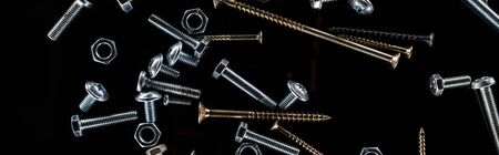 panoramic shot of scattered nuts, bolts and studs isolated on black