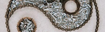 top view of aged metal gears and screws arranged in taijitu symbol on grey background, panoramic shot