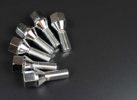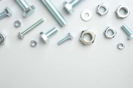 Artwork from gray automotive bolts on blue background close up. Copy space.