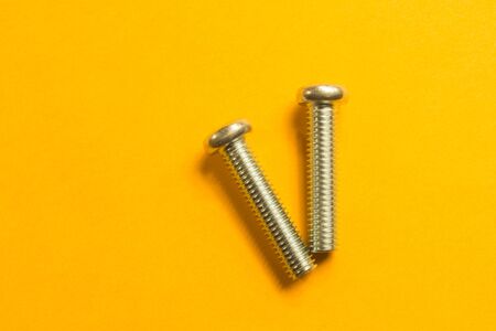Many different steel bolts and nuts on a yellow background. Close-up.
