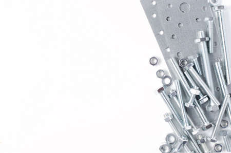 Repair tool. Bolts and metal mounting plates. White background. Copy space.