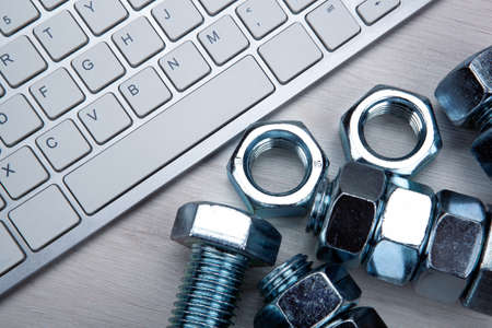 nuts screws fastening materials and pc keyboard on a wooden background top view