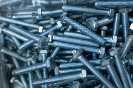 Steel bolts piled in the box. Fastening construction equipment. Fixing hardware.