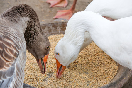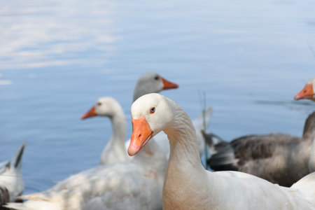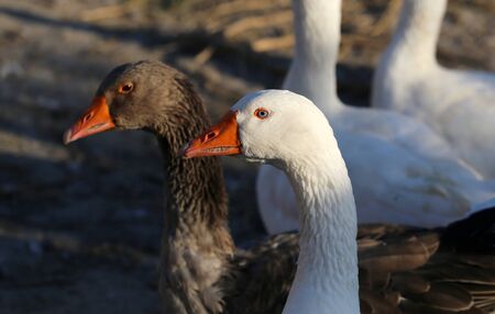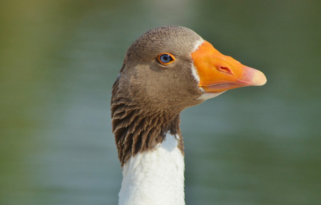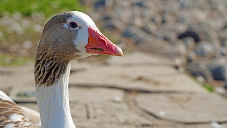 Close up of the head of a domestic geese, domesticated grey geese that are kept by humans as poultry for their meat, eggs, and down feathers since ancient times
