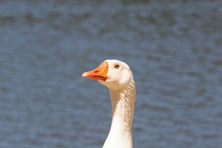 Domestic goose looks funny doing funny faces, white head with orange beak, farm long neck animals, dangerous look