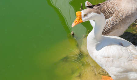 Amazing white domestic goose on the lake by the shore in wilderness. Looking at the water and ready to take a plunge in the pond, on sunny day.
