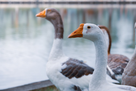 geese walk near the pond. birds get angry at tourists. domestic bird.