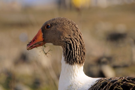 White and brown goose looking at the camera. Green and brown background.