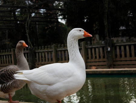 white duck close-up natural background orange beak gray neck
