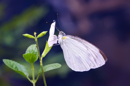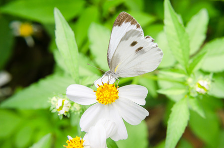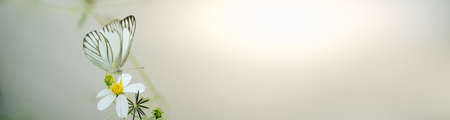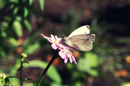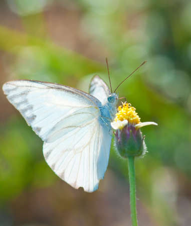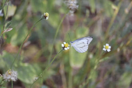 Small white butterfly genus Pieridae sitting on flower. Nature background.