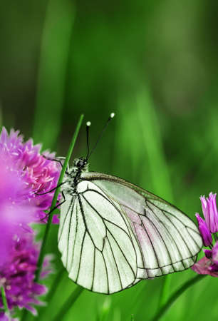 A closeup shot of a wonderful white butterfly sitting on a purple flower