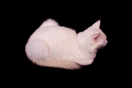 Side view, low-angle shot of a young white cat lying isolated on blank background